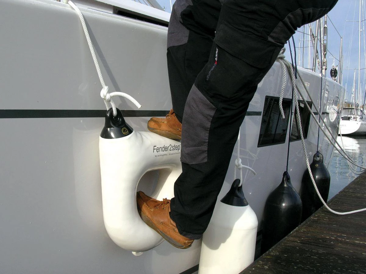 Fender2step™ was developed from the proven and very successful Fenderstep but also provides an extra step which is really helpful not only for boats with very high topsides, but also on regular sized boats to allow children to safely get on and off and in making boarding from a dinghy even easier. Like FenderStep™, it is easy to rig at any time, and importantly, BEFORE, entering a marina, allowing the crew to safely and easily step onto a pontoon.
