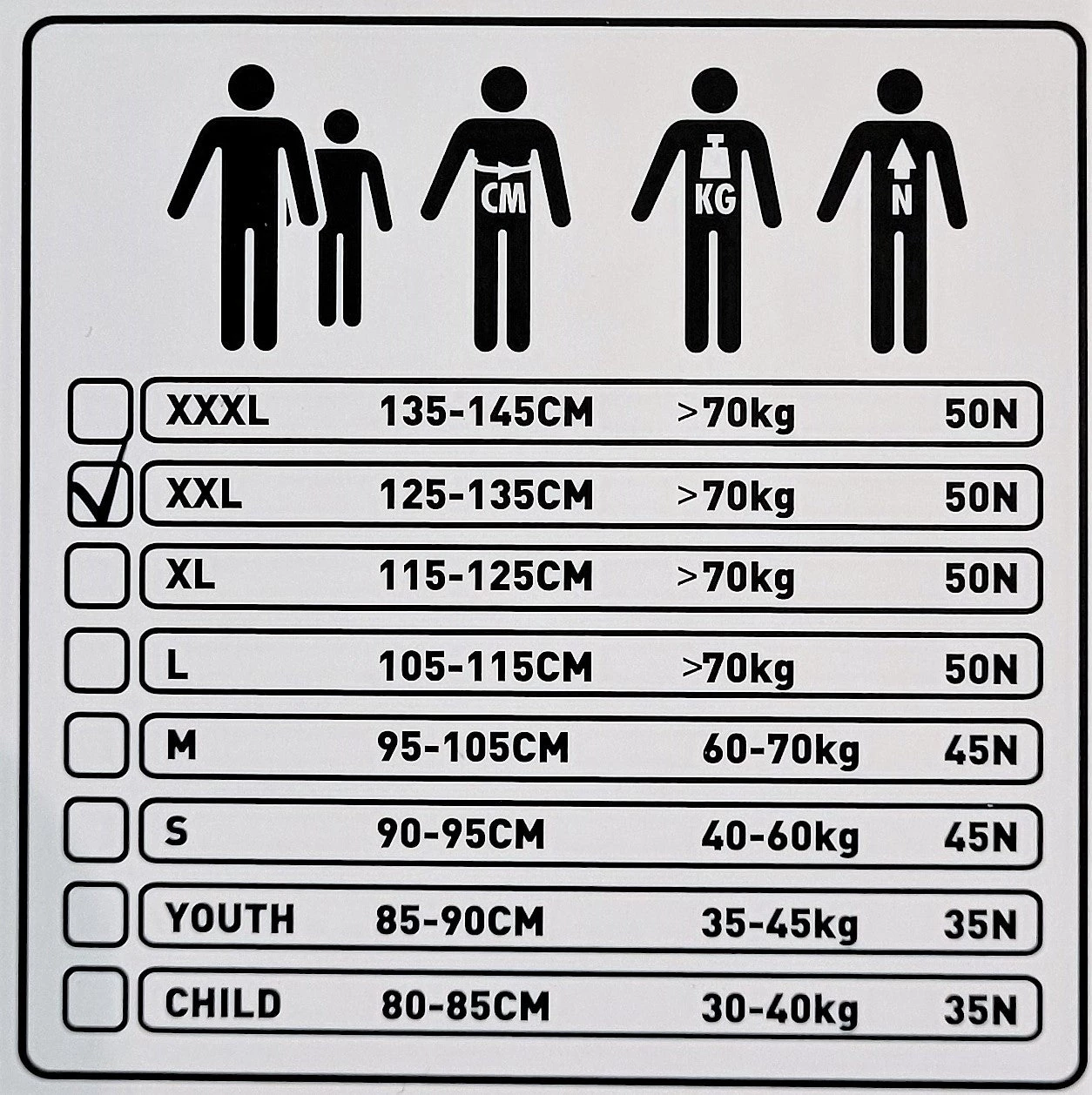 | Size | Small – 40-60kg, Medium – 60-70kg, Large – 70+kg, X-Large – 70+kg, XX-Large 70+kg |
