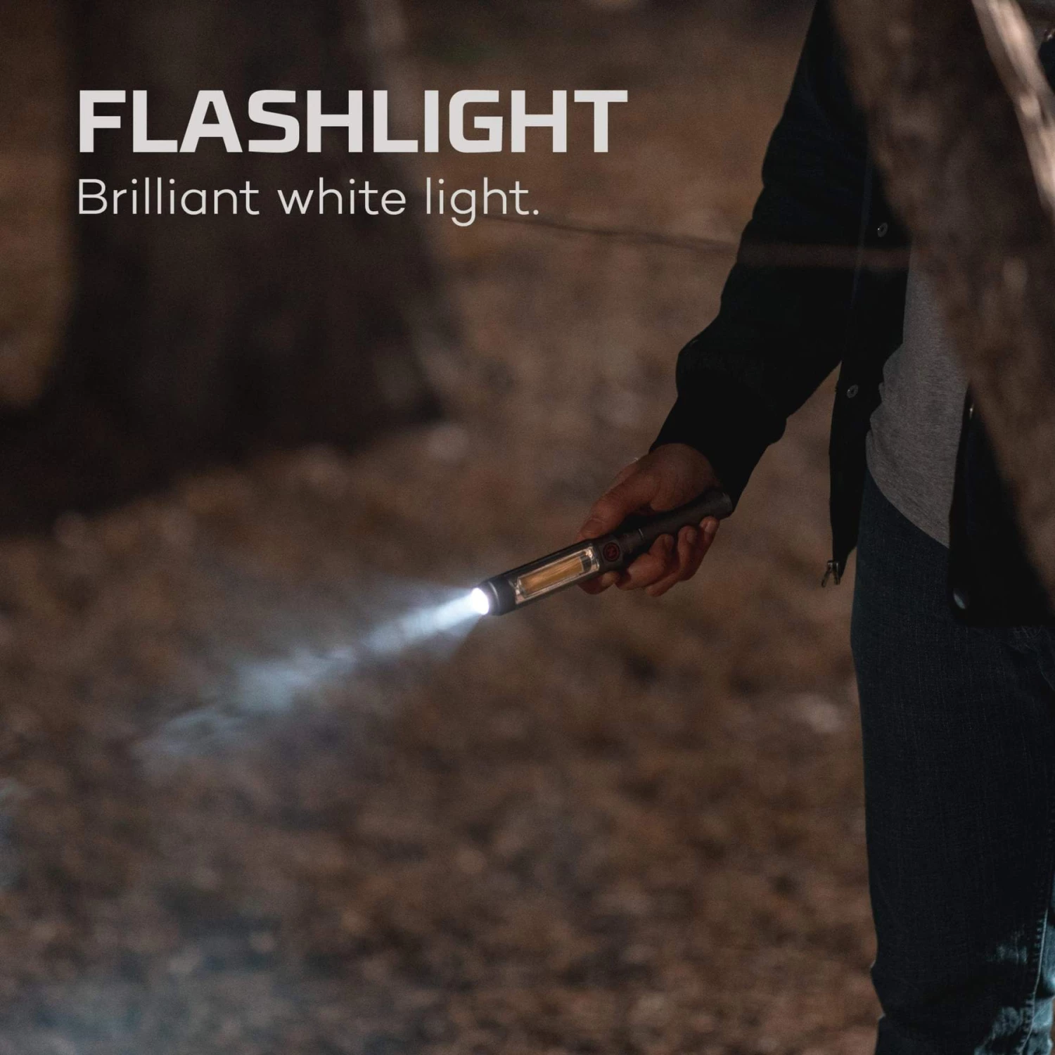 The Franklin™ Dual by NEBO is a powerful rechargeable handheld flashlight and work light with 7 light modes. The DUAL features COB technology in the work light and the powerful LED chip in the flashlight can shine up to 75 meters away. The included battery allows for up to 40 hours of operation in between charges.