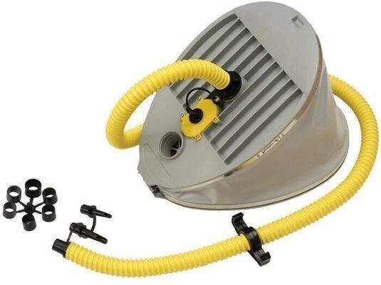 Foot pump with two air chambers that easily alternates between single and double chamber by removing a replacement plug. The closed position is for bringing tubes to an optimal pressure. The open position provides higher pressure and therefore is perfectly suitable for inflating airdecks.