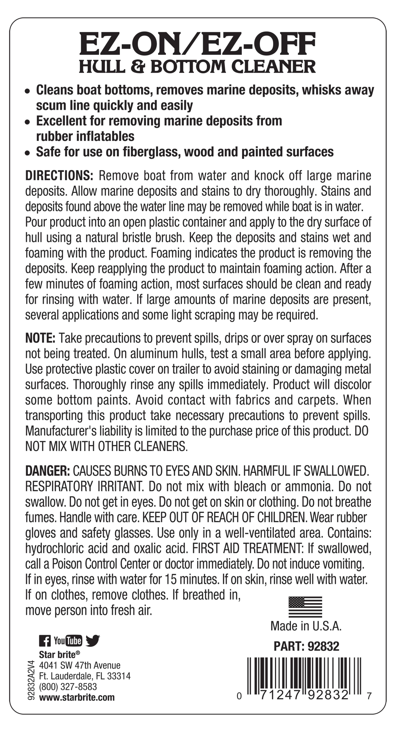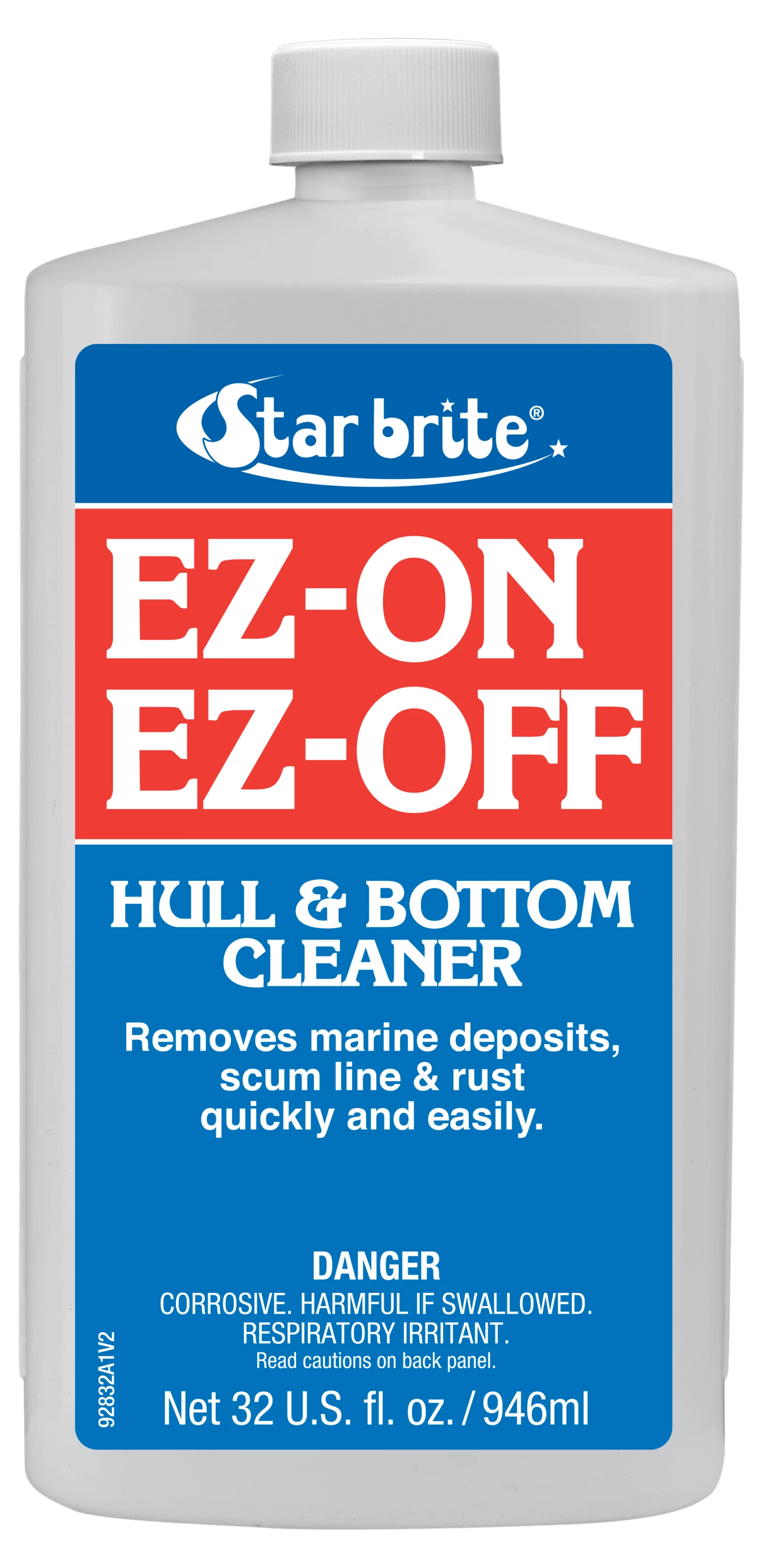 EZ-ON EZ-Off Hull & Bottom Cleaner is the best and easiest way to clean dirty bottoms and hulls. Loosens tough marine deposits, removes stubborn stains quickly and without hard scrubbing. Formulated with a special buffered acid that is safer to use than the harsh acids found in traditional bottom cleaners. Ideal for cleaning baitwells, fish boxes or in-deck storage.