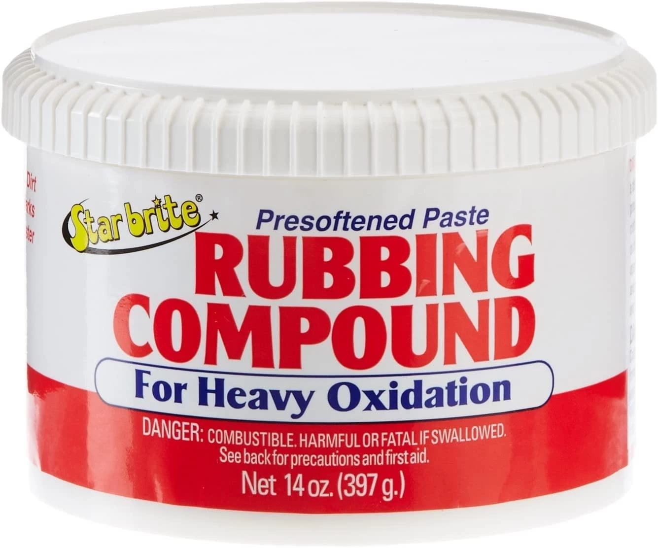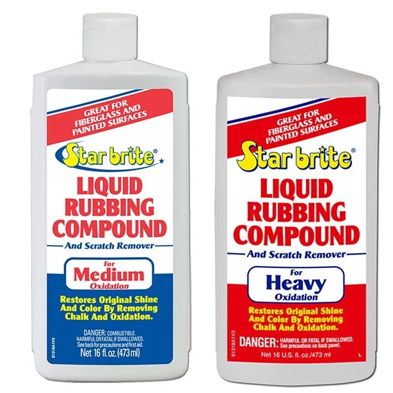 Wash surface with Star brite® Boat Wash to remove dirt and grime. Apply small amount of Star brite® Liquid Rubbing Compound to surface with a clean, dry cloth. Rub in a circular, overlapping motion with firm pressure while compound is wet. Rotate application cloth frequently to prevent reapplication of removed oxidation. Let dry until a haze appears and then buff with another clean, dry cloth. Do a small area at a time to ensure uniform cleaning. Several applications may be necessary to totally restore finish. If using an electric buffer, be careful not to apply too much pressure which can burn surface. After original color and luster have been restored, it is recommended that the surface be sealed and shined with a Star brite® polish. NOTE: All rubbing compounds are abrasive and can scratch gelcoat, metal and painted surfaces. We suggest you first try Star brite® Fiberglass Color Restorer & Sealer before using a rubbing compound. These products are much less abrasive and can usually restore moderately oxidized surfaces to a “like new” condition.