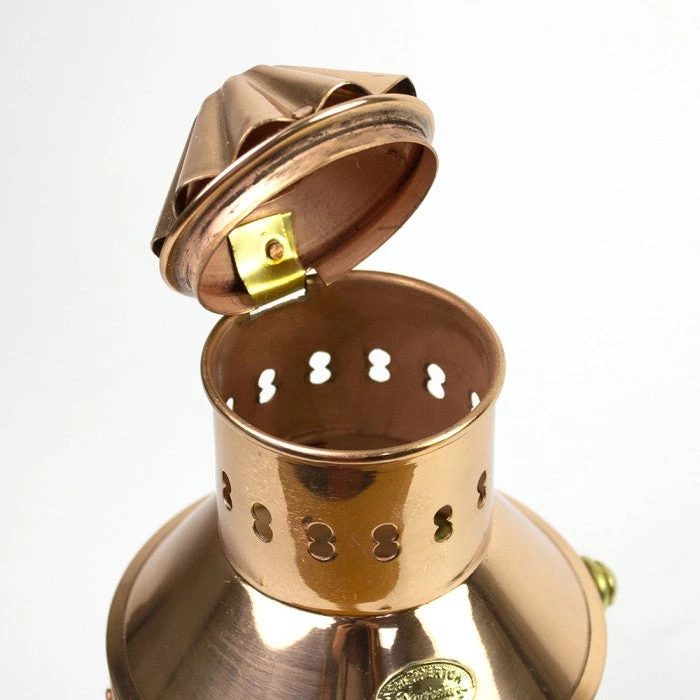 Originally designed to burn all night, to warn other vessels whilst at anchor, these lamps are sturdily constructed from copper, with brass fittings and chunky glass lenses. Hanging loops are provided top and bottom to enable ease of mounting. Oil burner uses 12mm wick.