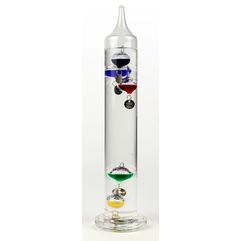 This distinctive ornamental (but functional) thermometer utilise 17th century astronomer Galileo Galilei’s discovery that the density of liquids varies with temperature. Carefully weighted glass globes are suspended in a liquid-filled tube, where they sedately sink or float as the surrounding air gets hotter or colder. Temperature is indicated by the engraved brass tag on the lowest floating globe.