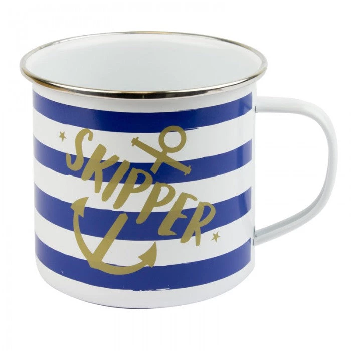 Whether for a boating-themed party, a gift for those hard-to-buy for ‘Yachties’, or simply keeping track of which drink is whose on board, these fun nautical enamelled tin mugs with jaunty blue and gold designs are sure to raise a smile (The name appears on both sides of the mug, so suitable for right or left handed use.) Cheers! Capacity 530ml.