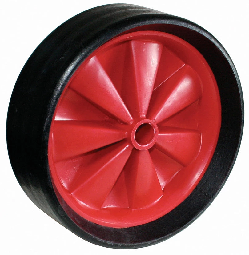 Wide solid rubber dinghy wheels, 28 cm diameter, 10 cm wide. Most suitable for launching from sandy beaches.