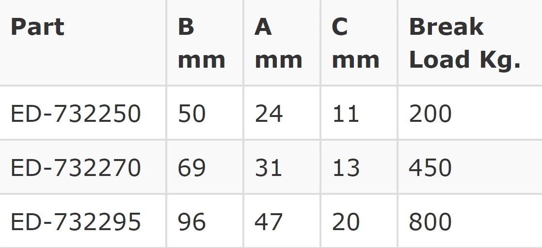 | Part | B mm | A mm | C mm | Break Load Kg. |