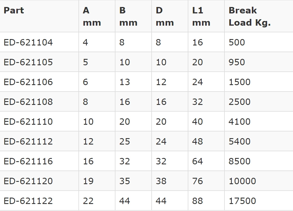 | A mm | B mm | D mm | L1 mm | Breaking Load Kg. |