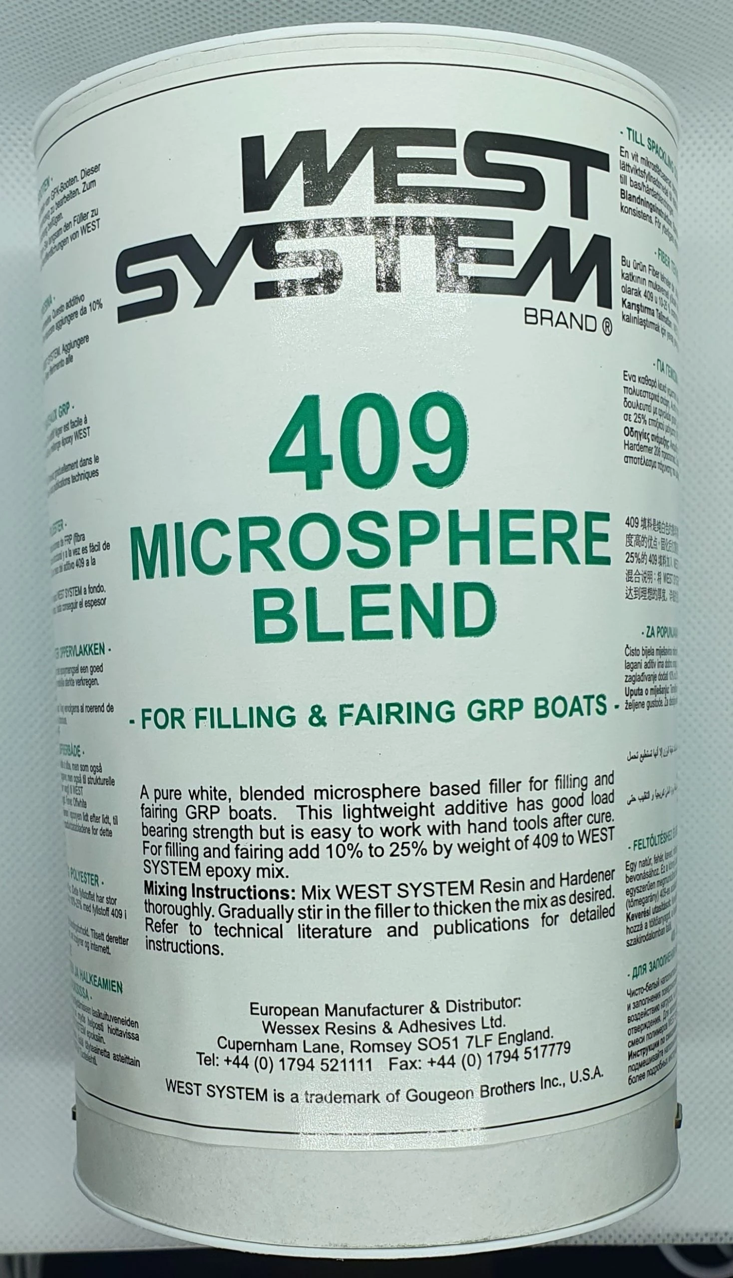 A pure white, hollow glass bubble-based, low density filler designed for filling and fairing of fibreglass. When the filler is mixed with WEST SYSTEM® epoxy at a ratio of 10% to 25% by weight, it creates a smooth creamy paste for filling and fairing over glass fibre repairs. The cured epoxy/filler is very easy to sand. Being white in colour the cured epoxy filler mix will be hidden easily behind paint or polyester gelcoat, but must be protected by further coats of epoxy if used below the waterline.