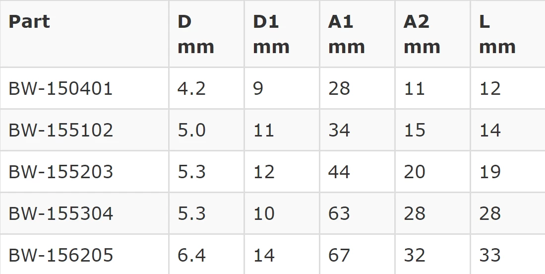 | Part | D mm | D1 mm | A1 mm | A2 mm | L mm | Pack Size |