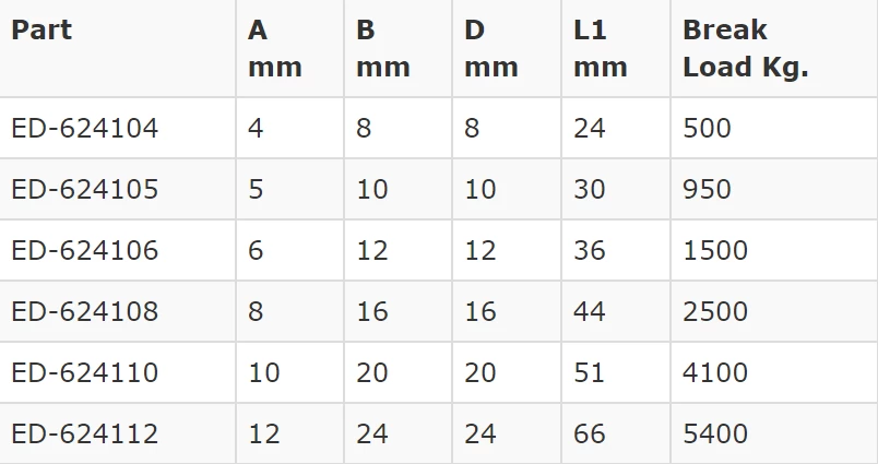 | Part | A mm | B mm | D mm | L1 mm | Break Load Kg. |